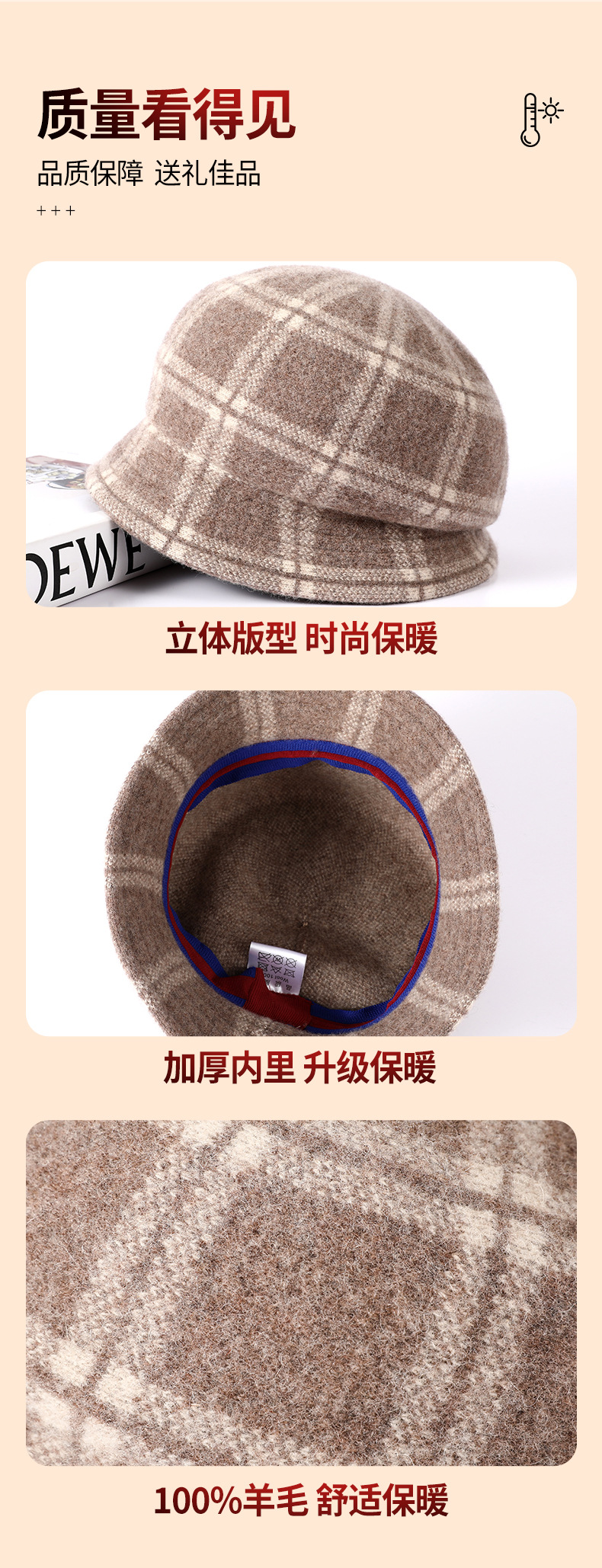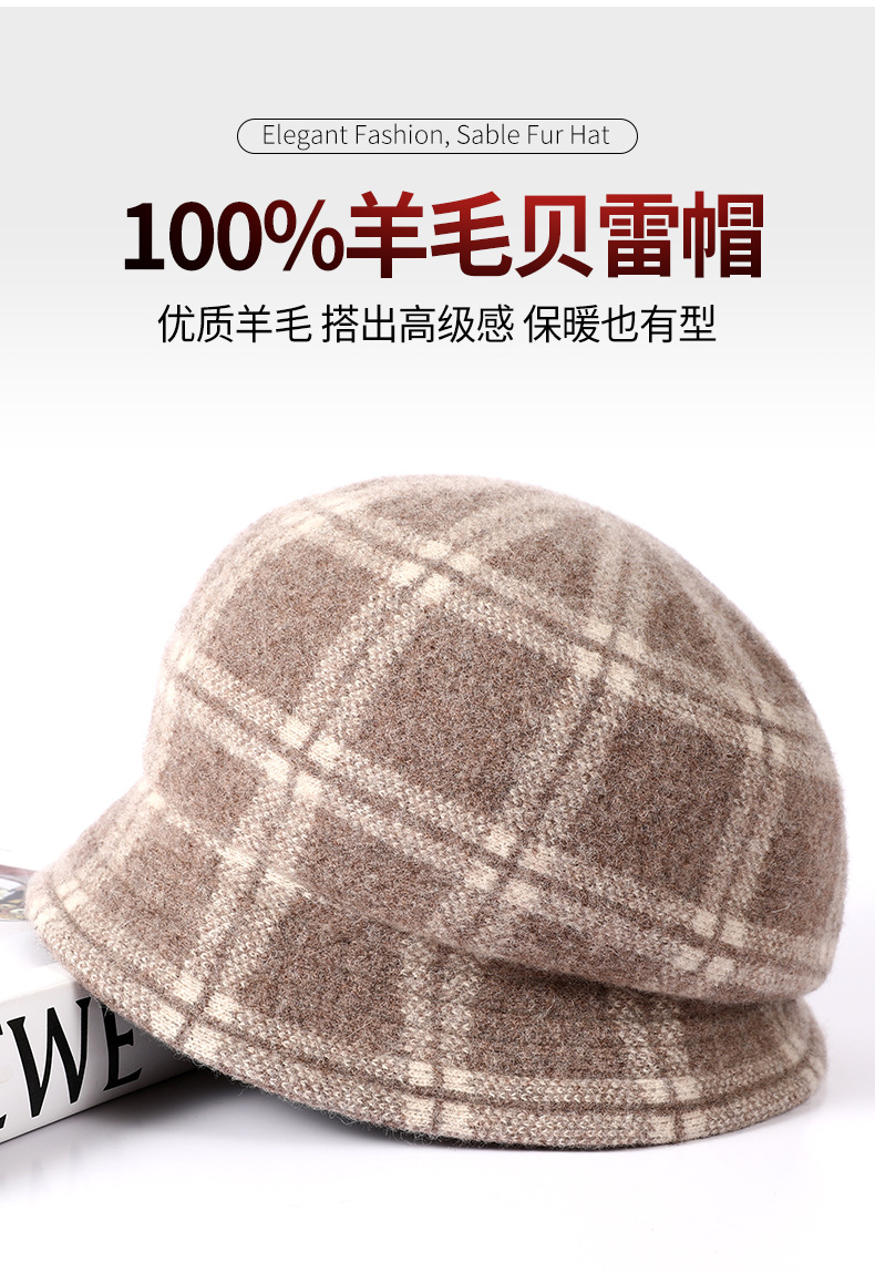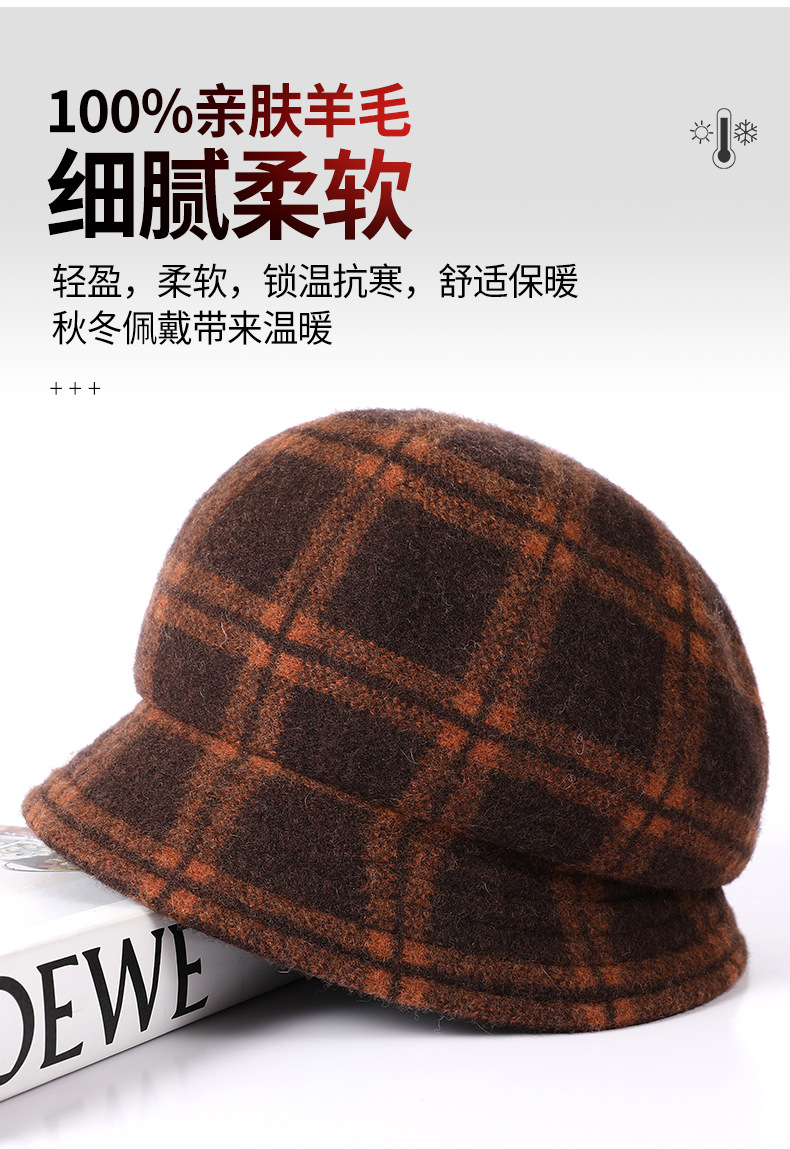 100% Quality Wool Basin Hat Women's Autumn-Winter Vintage Beret Checked Octagon Hat Warm Fisherman's Hat
