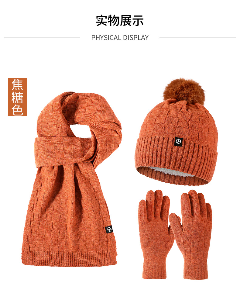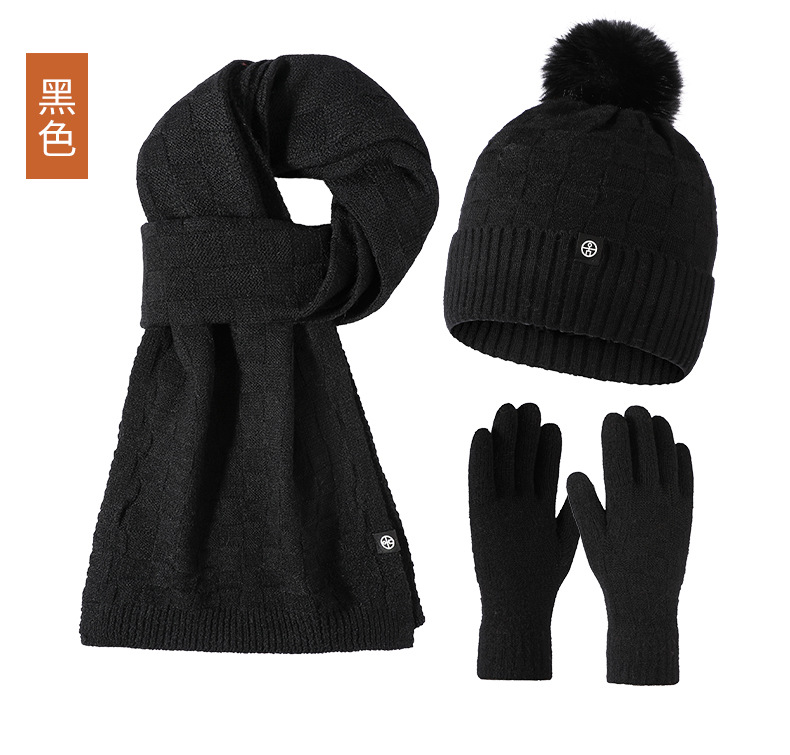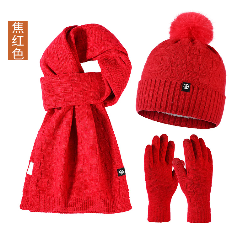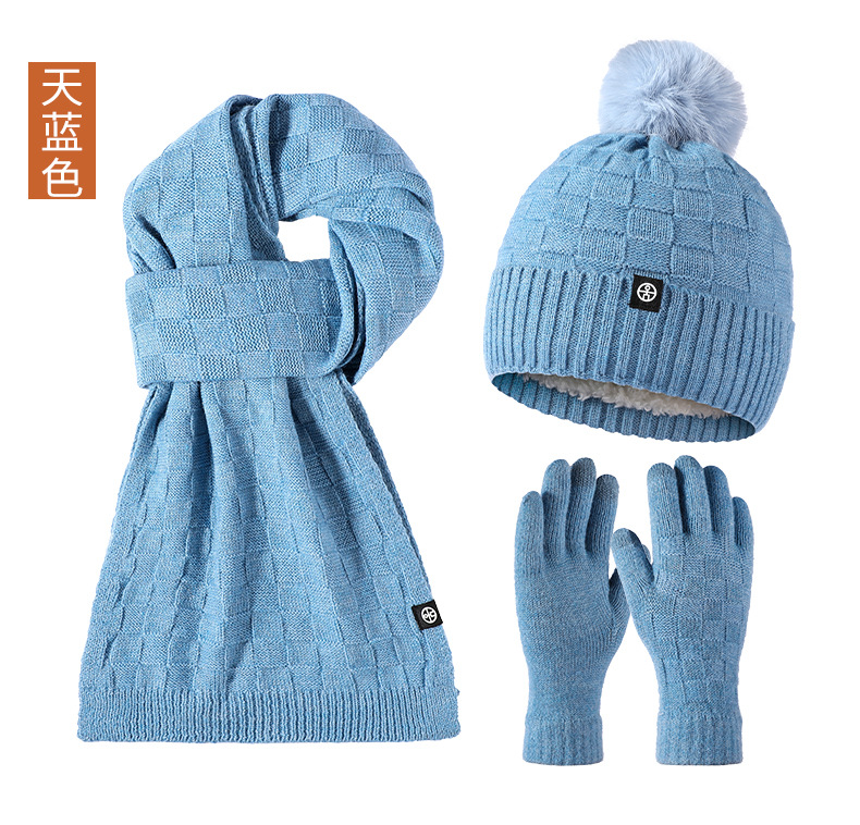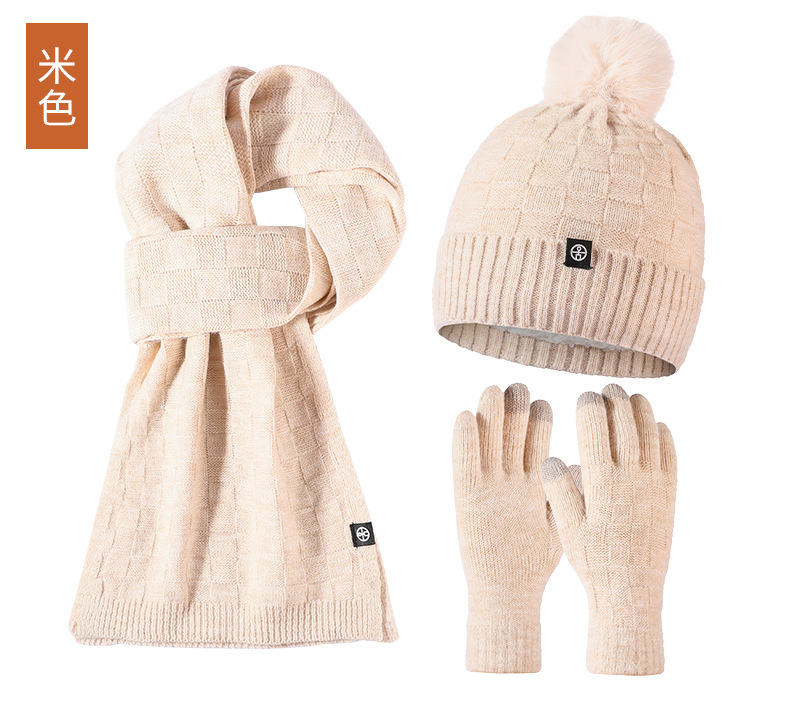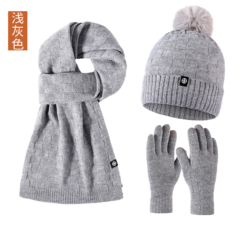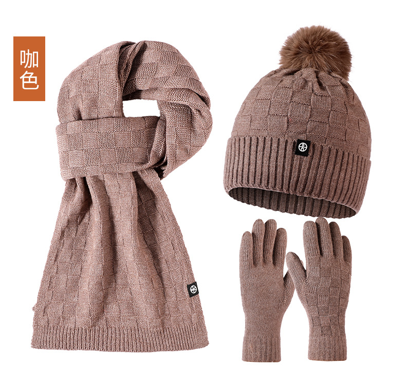 Cross-Border Foreign Trade High-Grade Wool Knitted Hat Scarf Gloves Warm Plaid Three-Piece Set Autumn And Winter